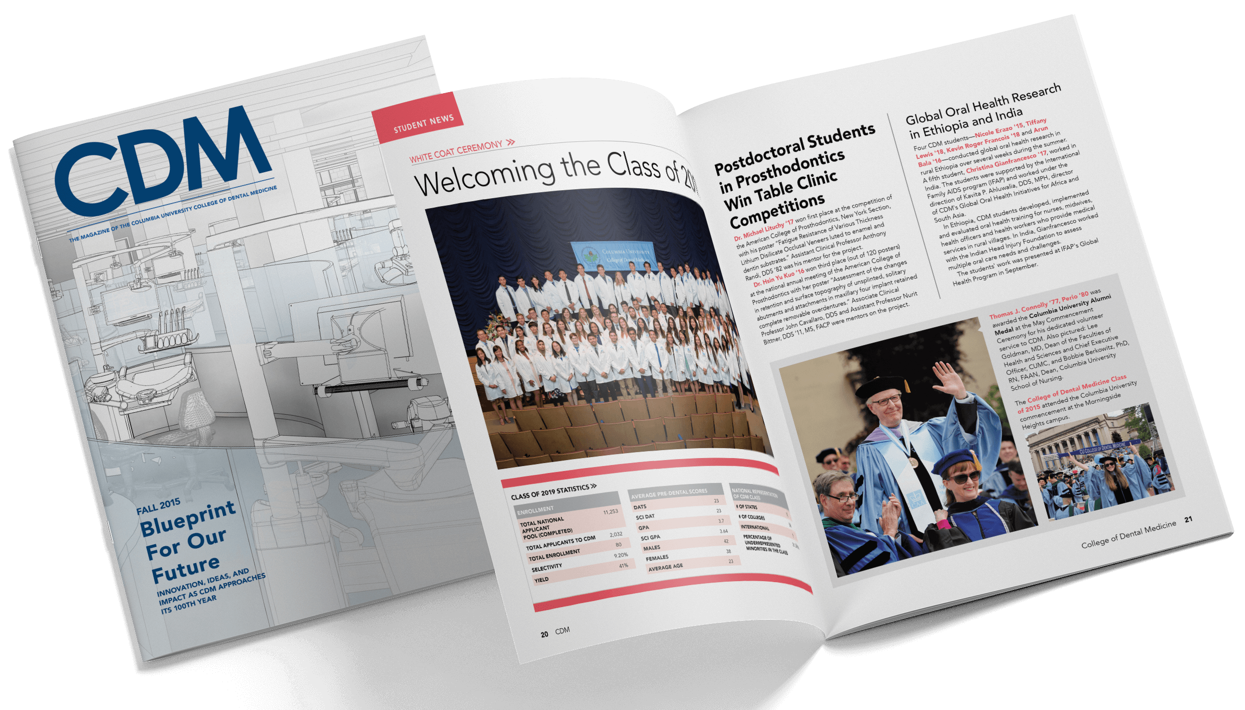 Columbia University’s College of Dental Medicine is a storied school that’s over a century old and can boast of thousands of alumni. In 2014, the university and college updated its branding and was in the process of ensuring all of its assets reflected it. While Columbia Dental Magazine needed to be redesigned eventually, the Winter 2015 issue didn’t align with the overall brand rollout timeline. Under the helm of a new marketing director, we instead cleaned up a recent redesign to introduce more order and hierarchy to begin establishing consistencies across the entirely of the magazine rather than by section.
